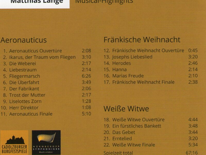 Am 06.06.2014 und 07.06.2014 sorgten die Nürnberger Symphoniker für ein kulturelles Highlight in der Hohenzollernburg in Cadolzburg. Unter dem Titel „Musik und Genuss – Klassik Open Air 2014“ wurden zwei Konzerte in dem romantischen Ambiente der Burg gegeben. Die Hälfte des Konzertprogramms bestand aus den symphonischen Musical-Werken von Matthias Lange. Ein unbeschreibliches Flair an beiden Sommerabenden sorgte für unvergessliche Konzerte.